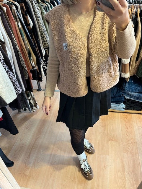 Le modèle mesure 1m63, porte une taille M (38)